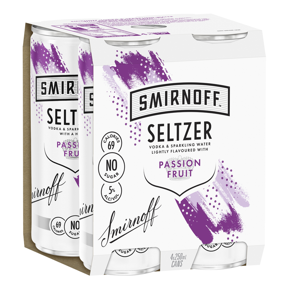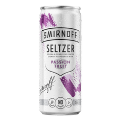 Smirnoff Seltzer Passionfruit is the perfect blend of Smirnoff vodka and lightly flavoured sparkling water. The sweet aroma of freshly cut passionfruit, fresh and clean taste of passionfruit on the palate with a fresh after taste. No Sugar and 69 calories per can.
