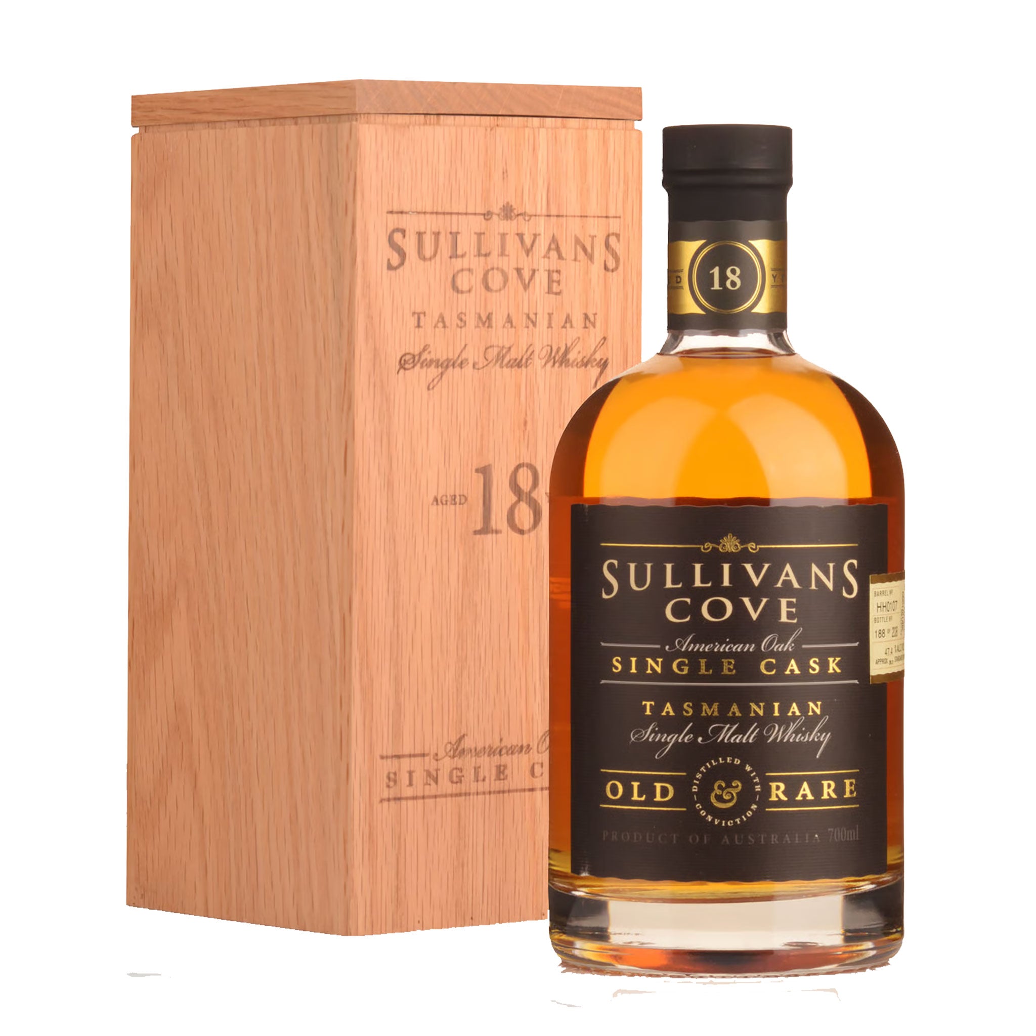 Sullivans Cove Old & Rare HH0108 is an 18-year-old single malt drawn from a solitary American oak ex-bourbon cask—filled in December 1999 and decanted in May 2018. Just 215 bottles were produced, each one a unique expression of Tasmania’s slow, meticulous whisky craft.