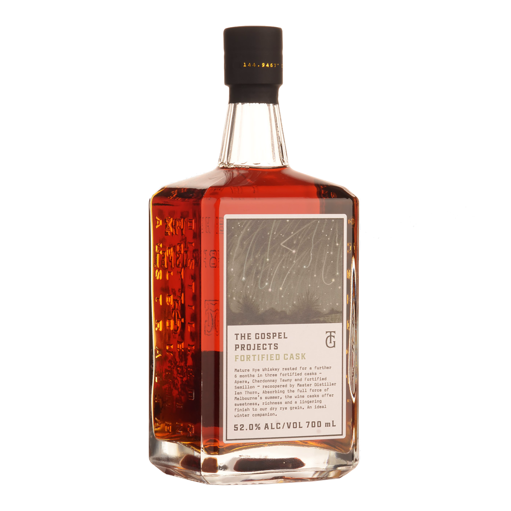 At Gospel, cask selection is a crucial step in the whiskey making process. They believe that knowing the story of each cask is essential, from the forest where the oak is sourced to the liquid that previously filled it. For their special Project Release, The Gospel carefully selected three Australian ex-fortified wine barrels - Apera, Chardonnay Tawny and Fortified Semillon - to balance the signature dry rye grain with a richer and sweeter finish. The fortified casks were delivered fresh and recoopered at the distillery by Master Distiller Ian Thorn. The mature rye whiskey, selected for its medium body and slightly drier finish, was then filled into the fortified casks. This created the perfect foundation for the residual sweet wine remaining in the fortified casks, resulting in a unique and complex flavour profile. To showcase the interaction between the whiskey and the oak, as well as provide a higher viscosity and lingering flavour, Fortified Cask was intentionally released at 52% ABV. This ABV selection perfectly represents the spirit's character and highlights its unique qualities.