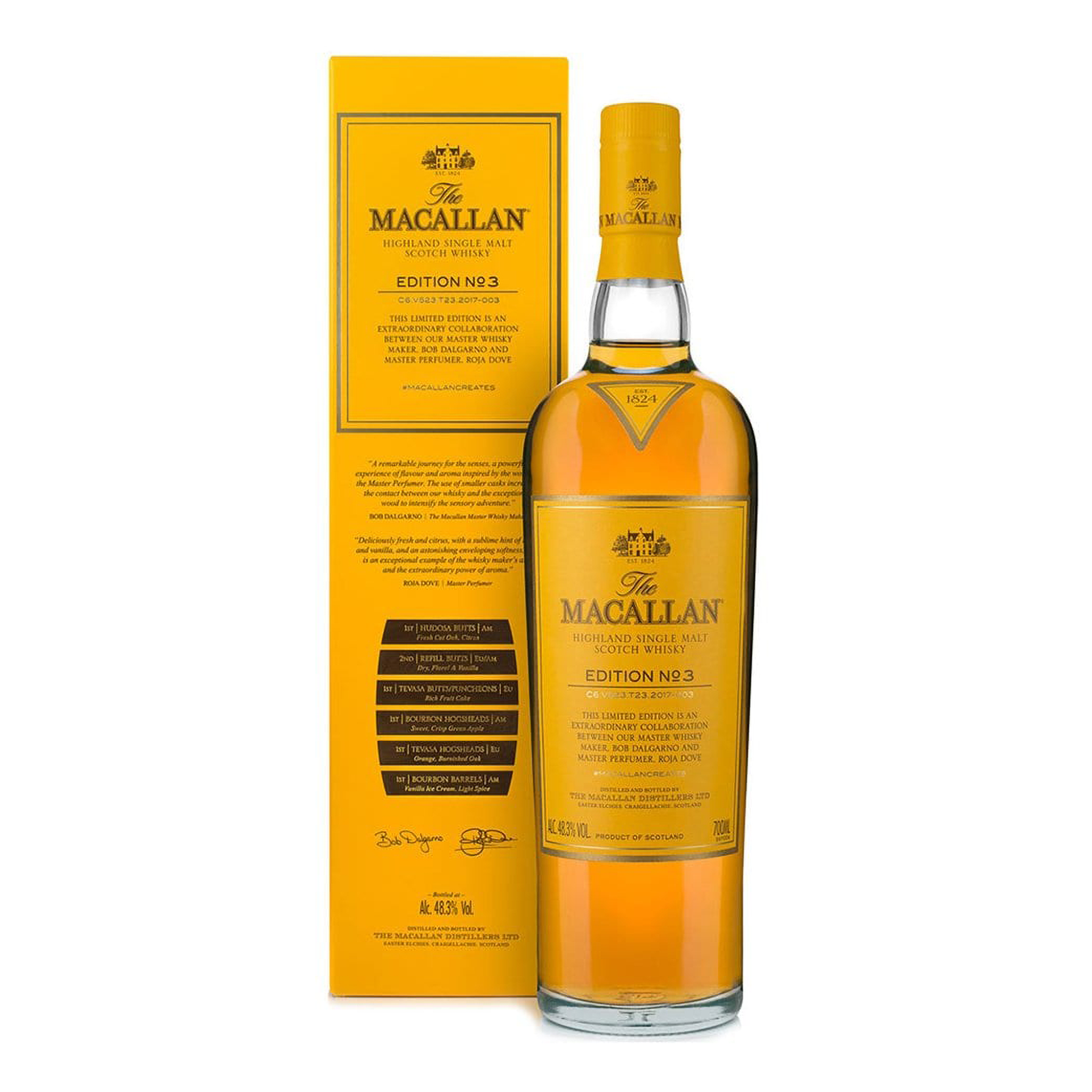 The Macallan Edition No. 3 is an exceptional whisky that embodies the rich complexity of The Macallan’s oak cask expertise. This release is the result of a collaboration with renowned perfumer Roja Dove, who selected specific oak casks to craft a whisky with a distinct aromatic profile. Edition No. 3 is a vibrant, full-bodied whisky with a strong aromatic intensity, showcasing the perfect balance between sweetness, fruit, and spice.